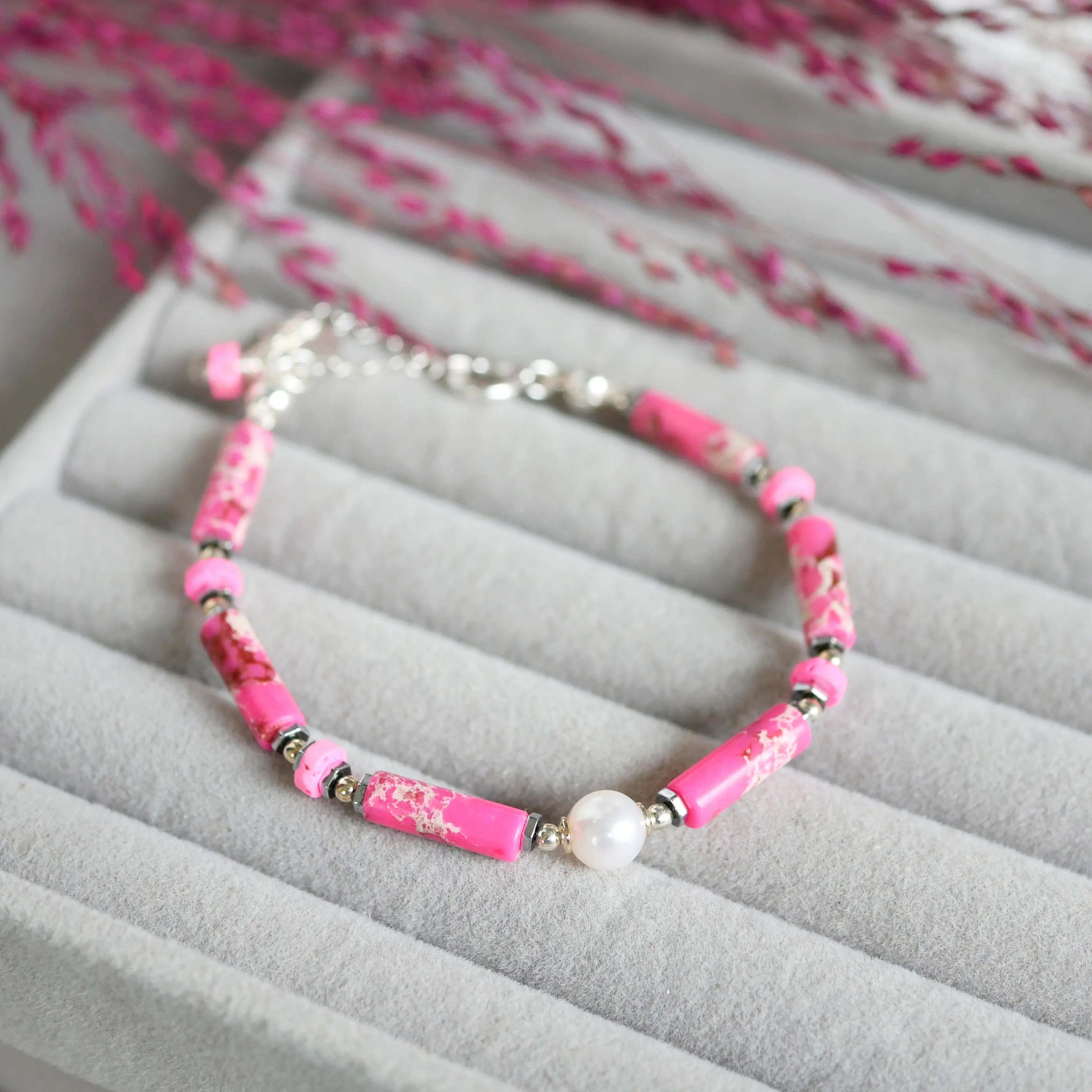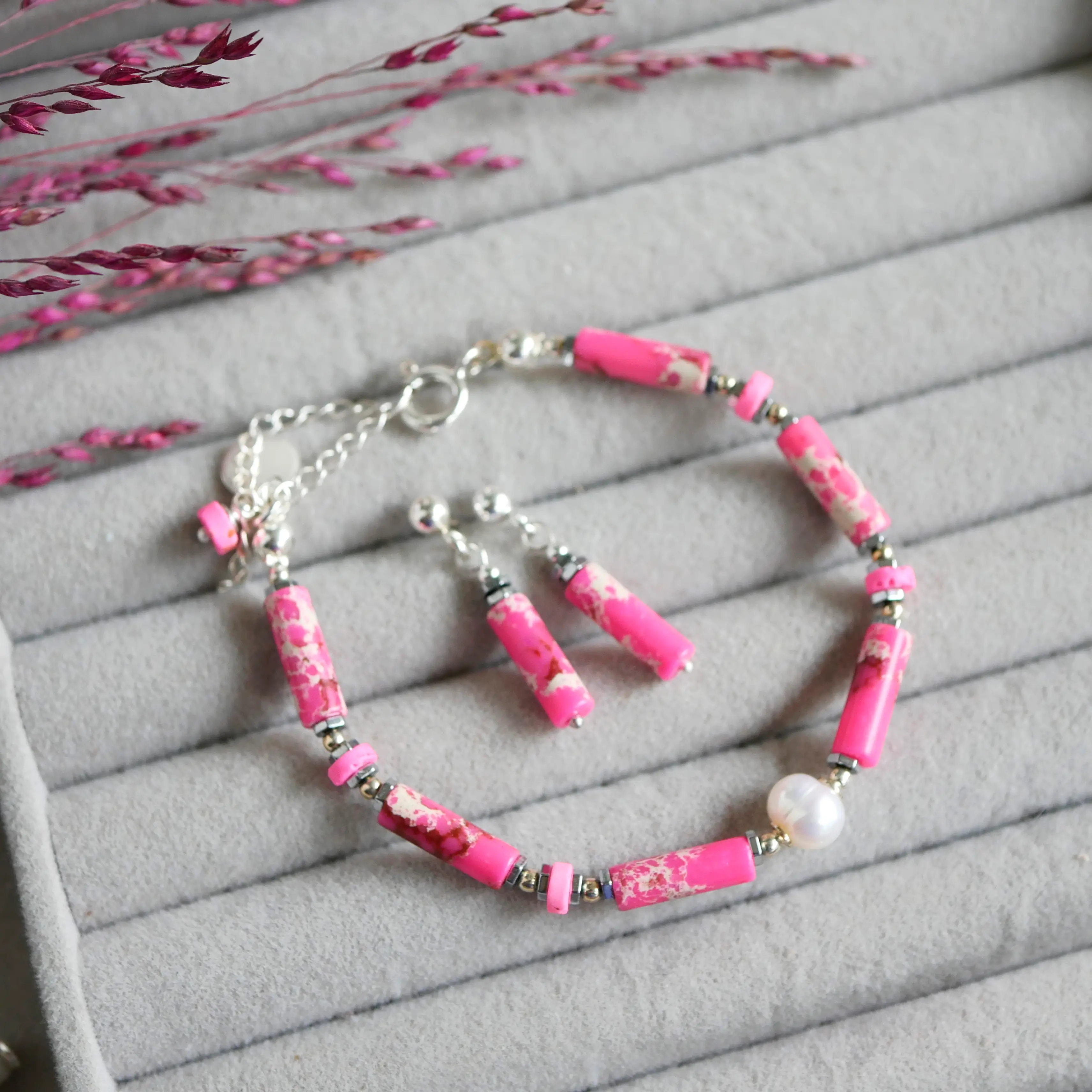 Ciepły odcień różu przełamany naturalną strukturą kamieni. Bransoletka Raspberry Glow to kompozycja jaspisów w odcieniach malinowego różu, uzupełniona talarkami lawy wulkanicznej i subtelną, białą perłą.