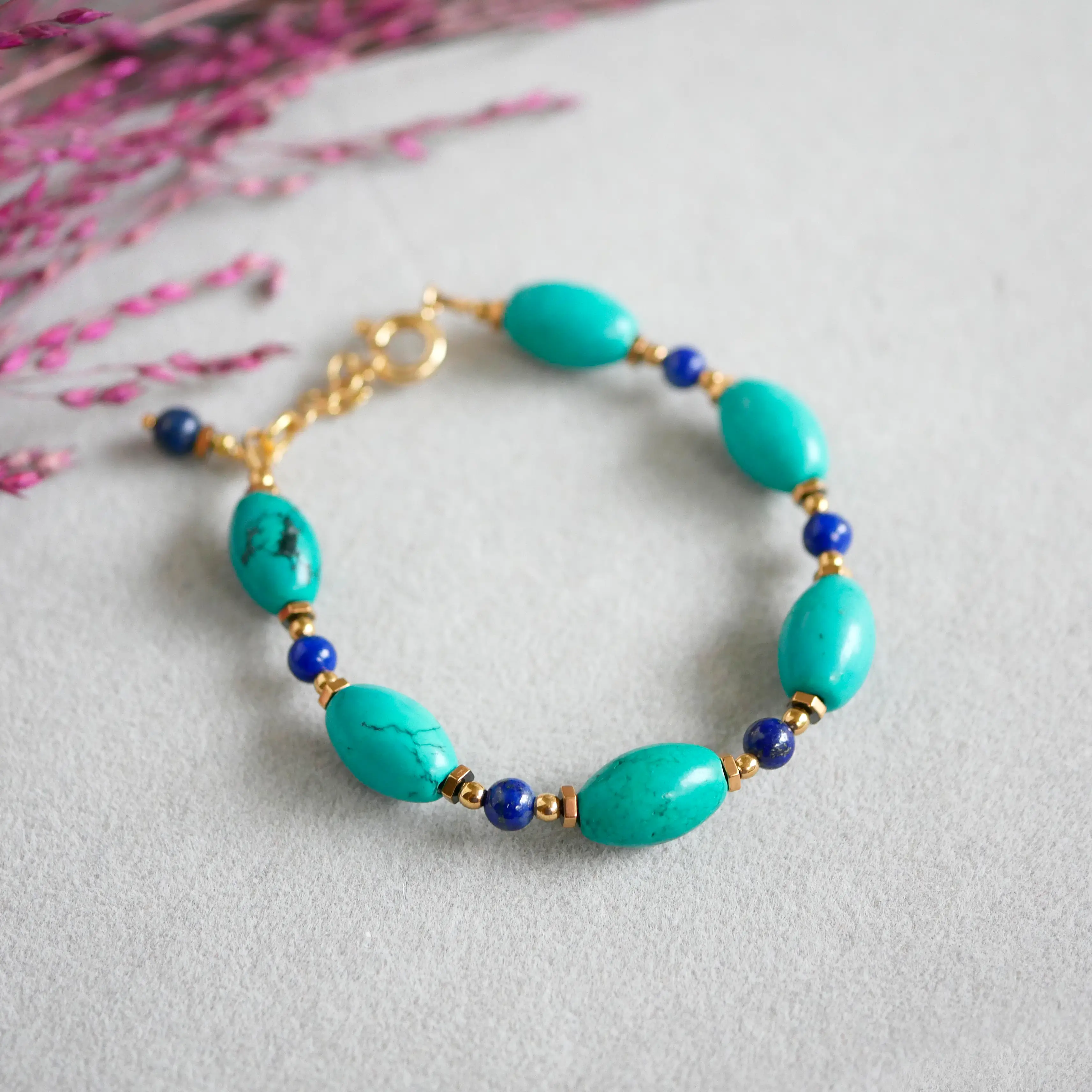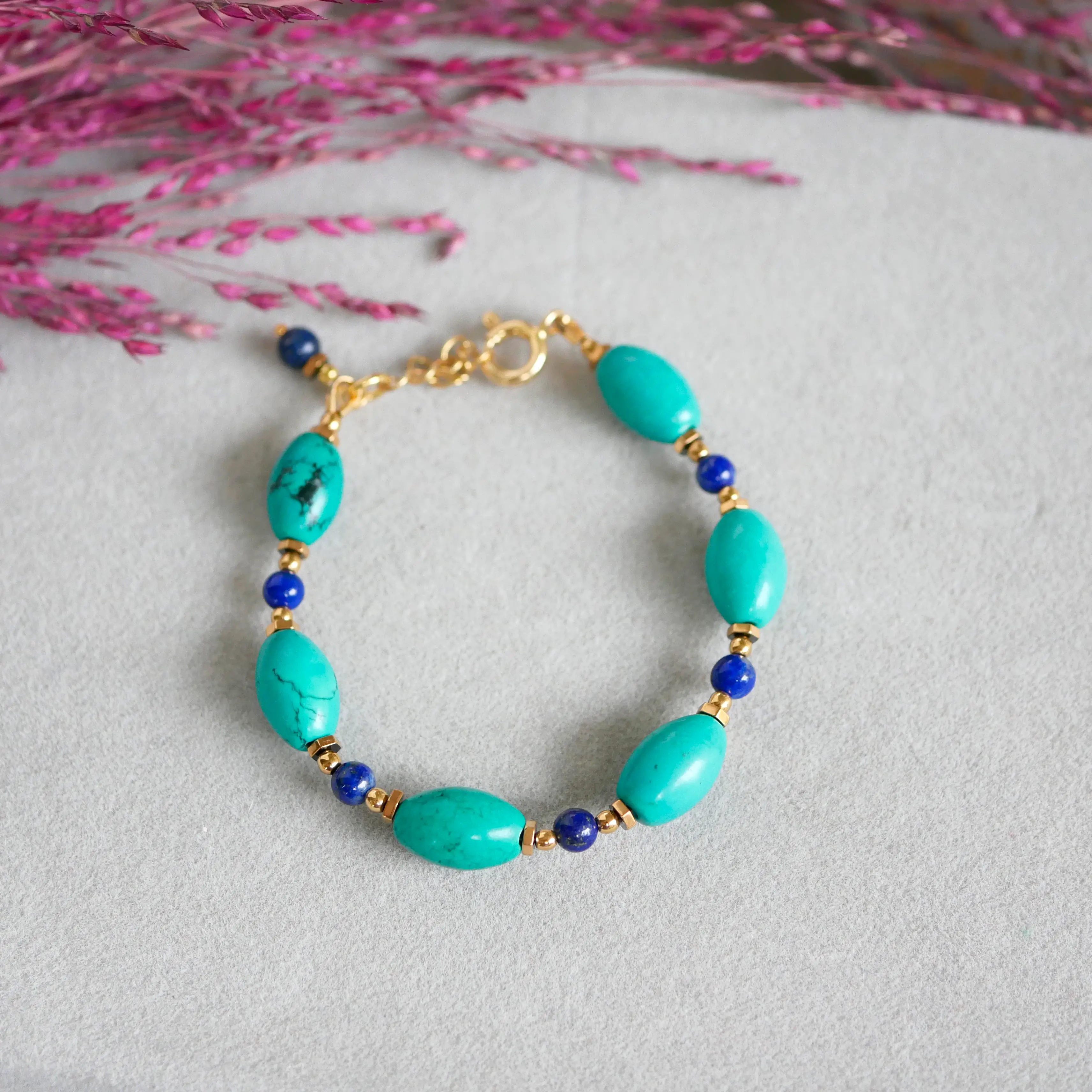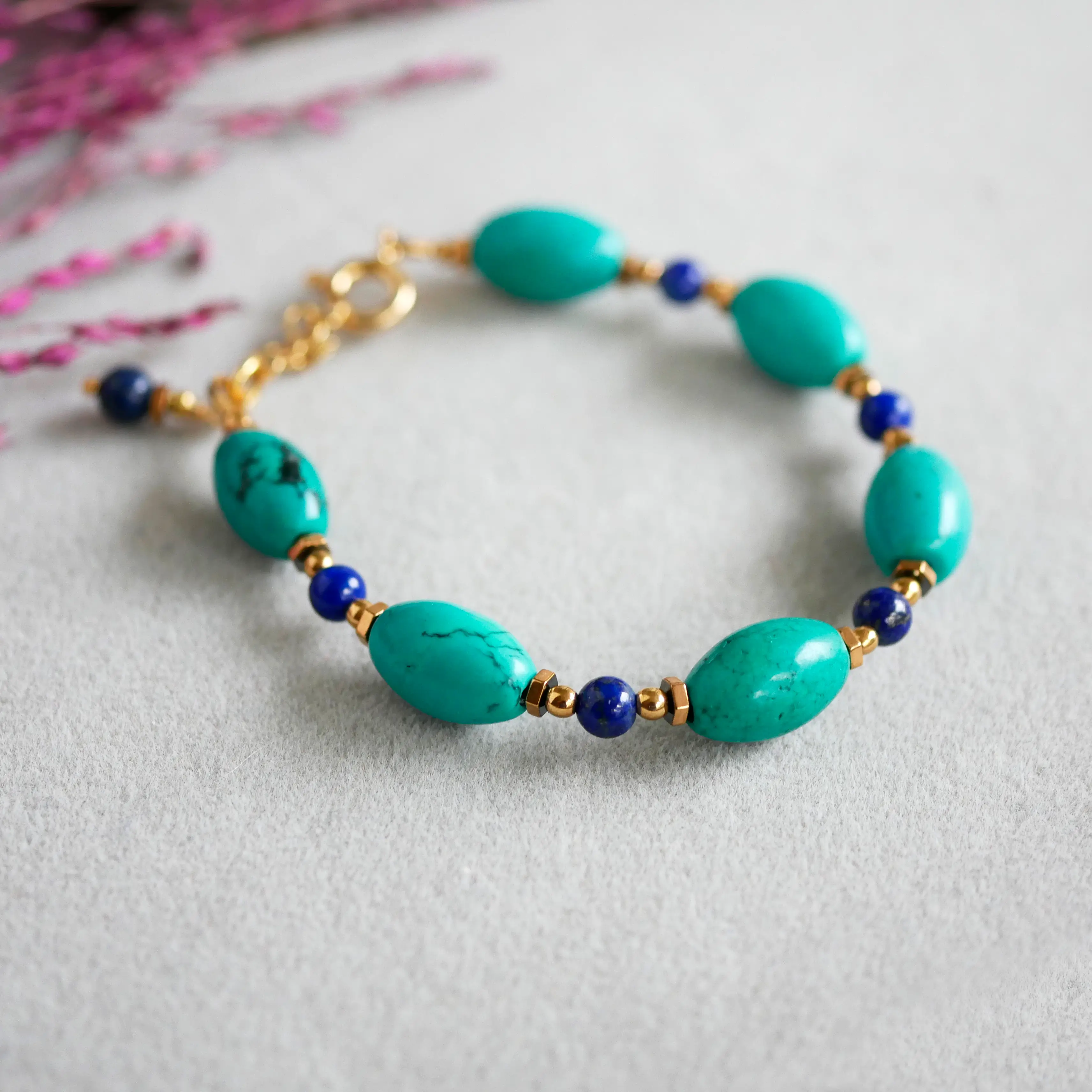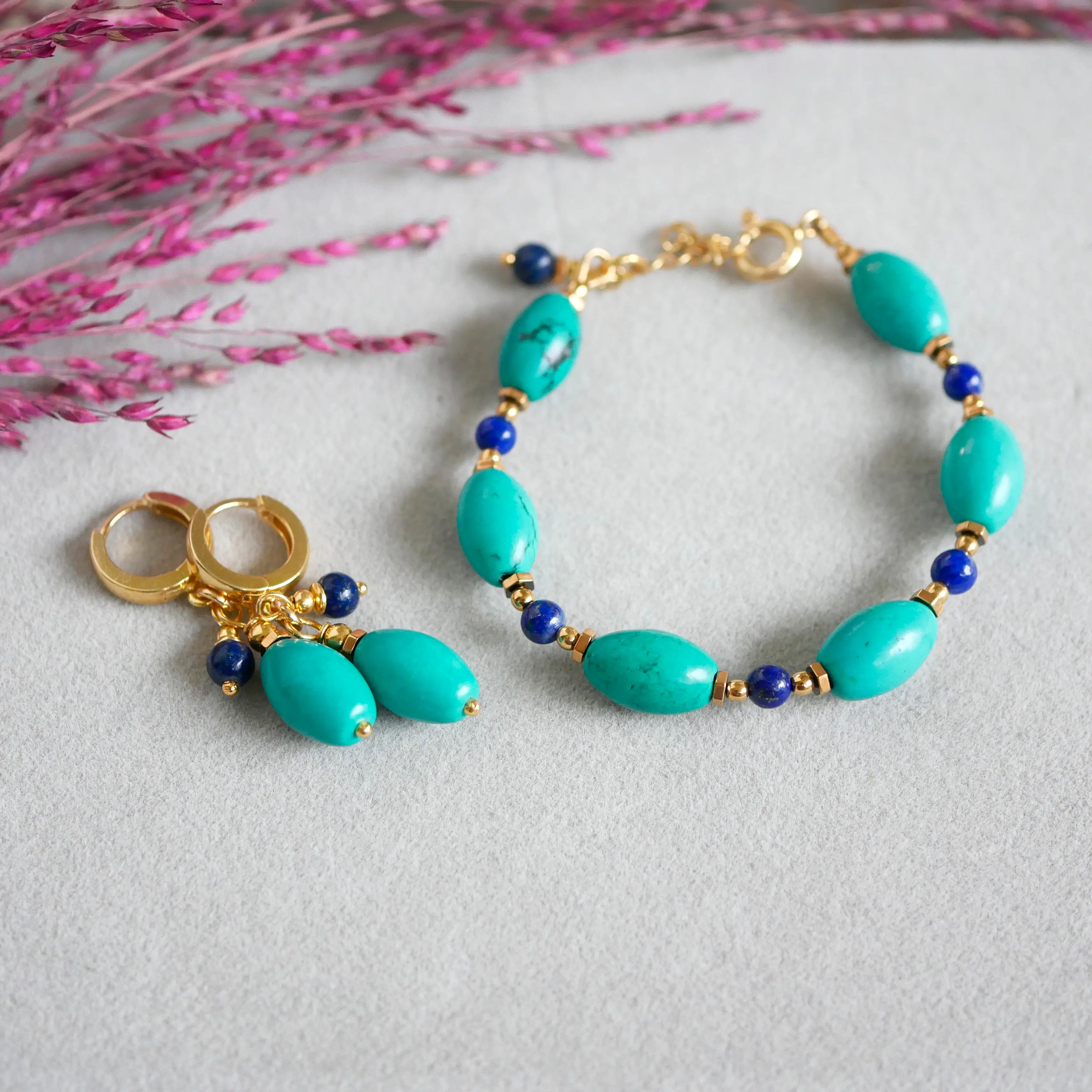 Owalne turkusy nadają rytm całości, a drobne kulki lapisu wprowadzają subtelny kontrast i głębię. Całość uzupełniają elementy z hematytu oraz wykończenie ze srebra — dostępne również w wersji pozłacanej, która dodaje ciepła i elegancji.