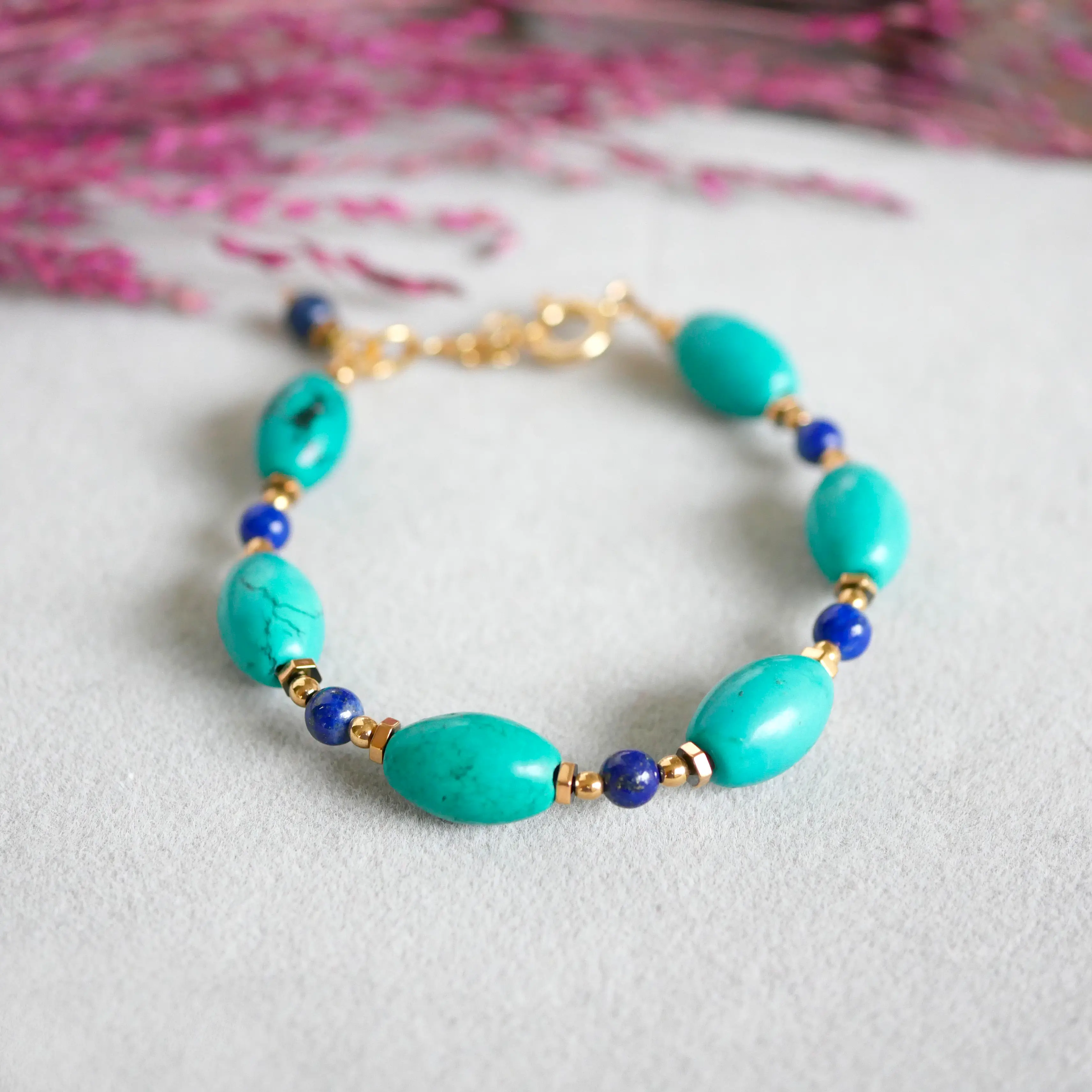 Kolor, który przyciąga spokój — i kontrast, który nadaje wyraz. Bransoletka Blue Balance to połączenie turkusów o intensywnym, świeżym odcieniu z głębokim granatem lapisu lazuli.